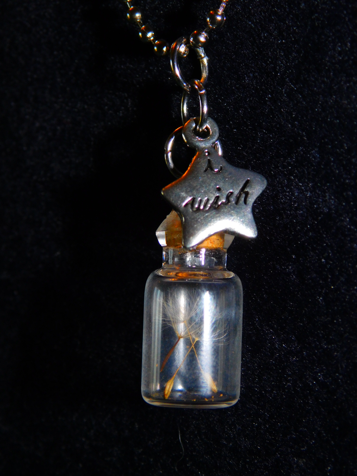 Small glass bottle contains three Dandelion seeds. Features a gold or silver plated "I wish" star and hangs from a gold or silver plated 20 inch ball chain necklace. Item is handmade, variances in appearance are to be expected. All parts are sourced locally in the USA.