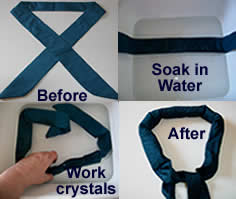 Submerge neck cooler in clean water for 10-30 minutes. During hydration make sure crystals are evenly distributed. Do not leave tie in water for long periods of time unattended as excessive hydration can cause seams to fail. Check for color fastness. Crystals will re-hydrate for years.